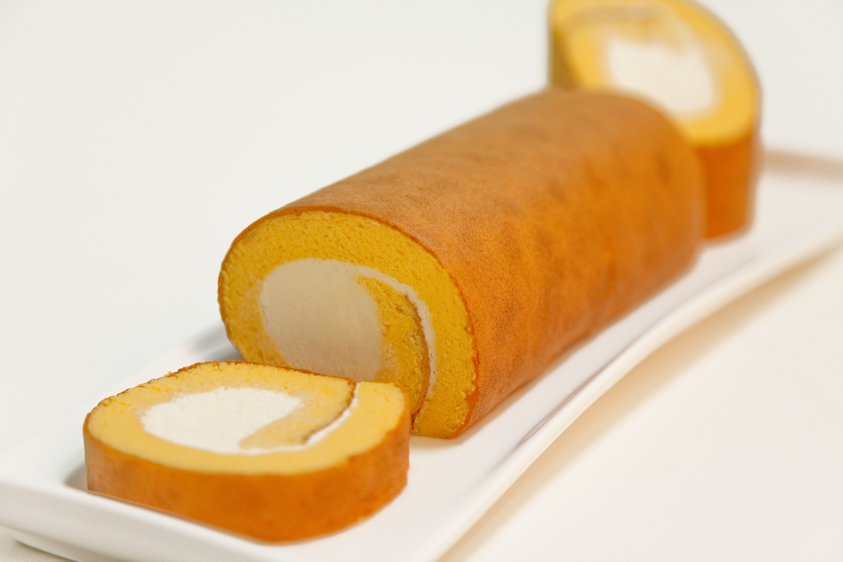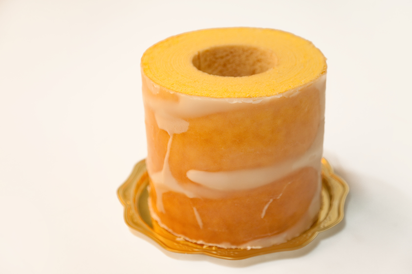 筒型に焼き上げたふわふわキャラメルシフォンケーキ。